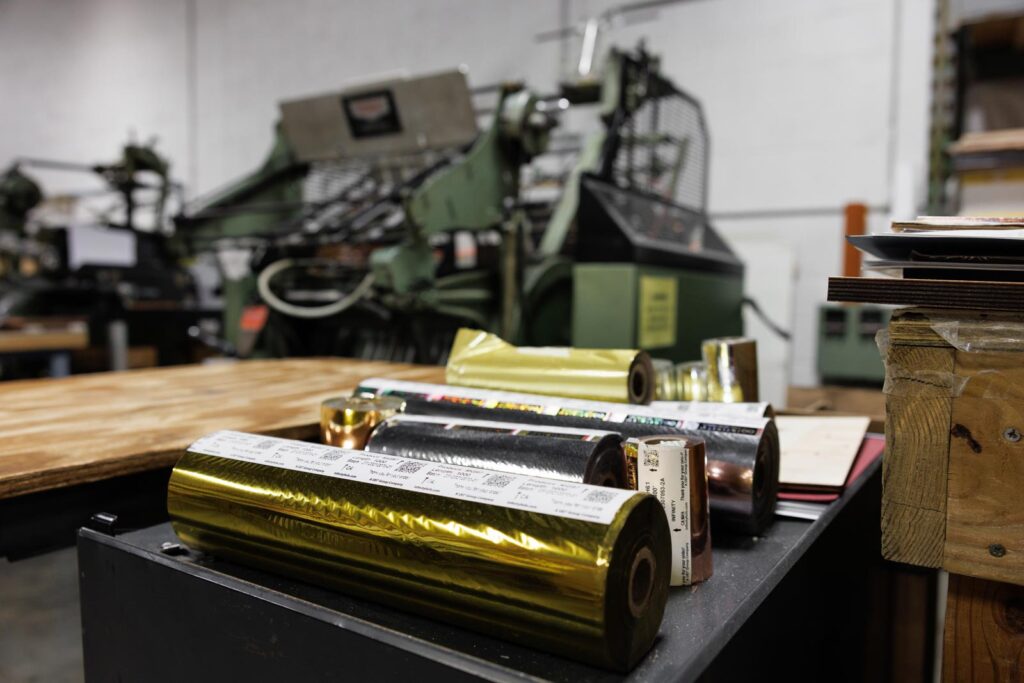 Foil stamping is a printing process that uses a heated die to apply a metallic or colored foil to a substrate with heat and pressure. Our experienced operators can foil stamp press sheets up to 23” x 28”.